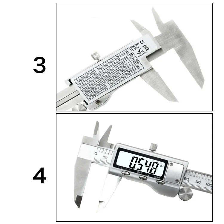 Our Stainless Steel Electronic Digital Caliper offers instant and accurate readings of inside, outside, step, and depth measurements with an accuracy of 0.001 “. SAE / Metric conversion switch automatically converts measurements to inches or millimeters with the simple press of a button. Adjustable thumbscrew provides tension for precision movement of the slider and locks the jaws of the caliper in place. Choose option ‘with box’ if you need a protective case with the caliper.