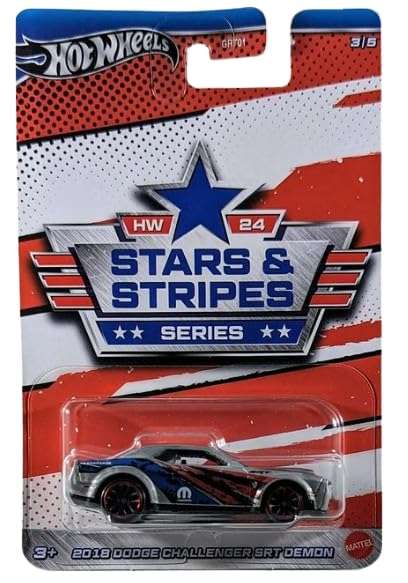 Unleash the power of the demon with the Hot Wheels 2018 Dodge Challenger SRT Demon, part of the HW 24 Stars & Stripes Series 3/5. This die-cast model car captures the raw muscle and aggressive styling of the iconic American muscle car, the Dodge Challenger SRT Demon. With its wide stance, menacing front grille, and bold graphics, this 1:64 scale replica is a must-have for any Hot Wheels collector or car enthusiast. Featuring detailed interior and exterior elements, it’s a miniature masterpiece that brings the thrill of the drag strip to your fingertips. Whether you’re building your Hot Wheels collection or looking for a unique gift, this Dodge Challenger SRT Demon is sure to leave a lasting impression. Collect the entire Stars & Stripes Series and celebrate the power and performance of American automotive engineering.