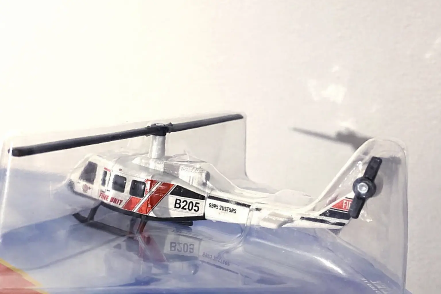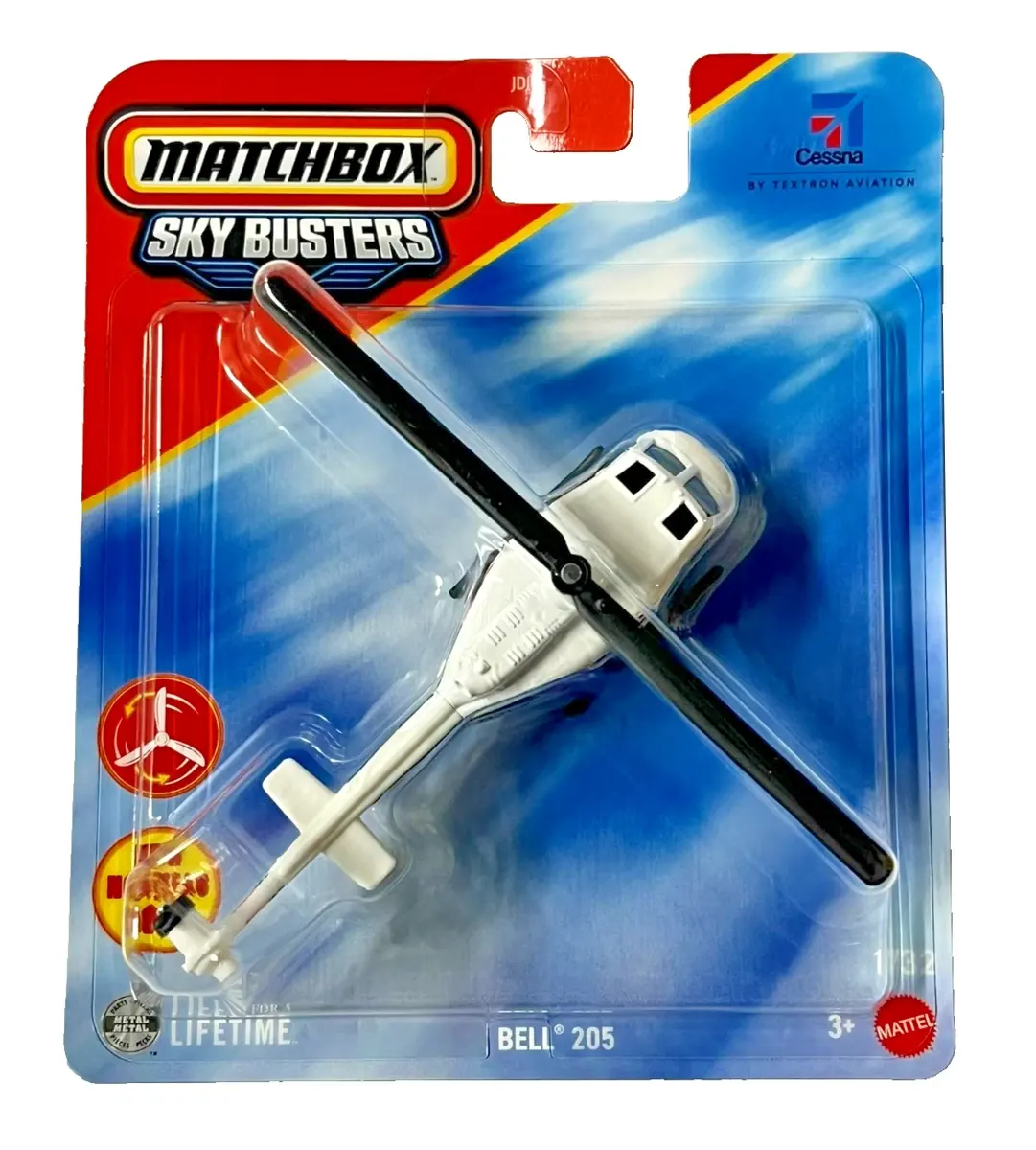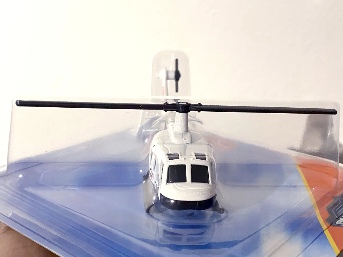 Constructed from die-cast metal with durable plastic components, this model offers a solid feel while preserving detailed proportions. Whether displayed alongside other Matchbox Sky Busters aircraft or used for imaginative play, the Bell 205 delivers durability; authenticity; and visual appeal.